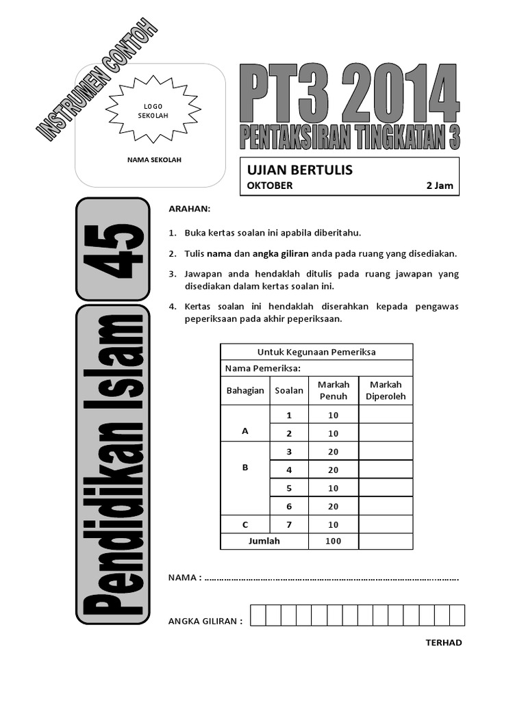 Format PT3 Bagi Subjek Pendidikan Islam Ujian Bertulis Tugasan memerlukan murid untuk memberikan respon secara bertulis dalam bentuk ujian objektif atau subjektif. Himpunan Latihan Topikal PT3 Pendidikan Islam Tingkatan 3. Penerbit Ilmu Bakti menerbitkan Firasat PT3 - Kertas Model PT3 Pendidikan Islam pada 2021-08-05.